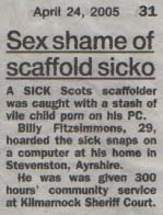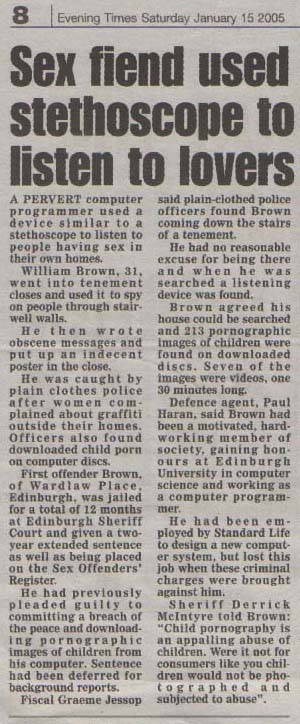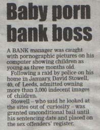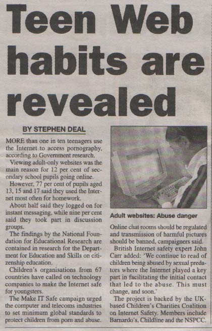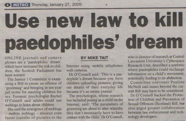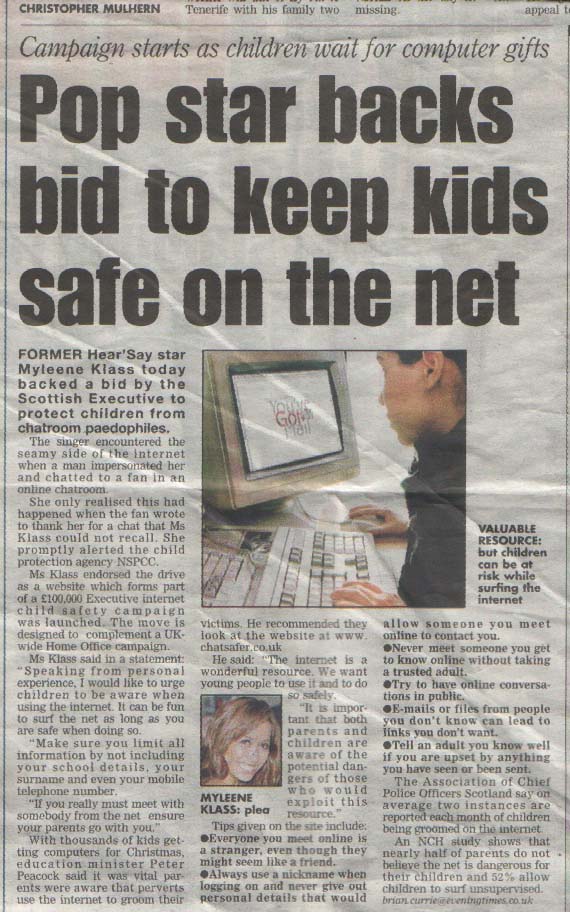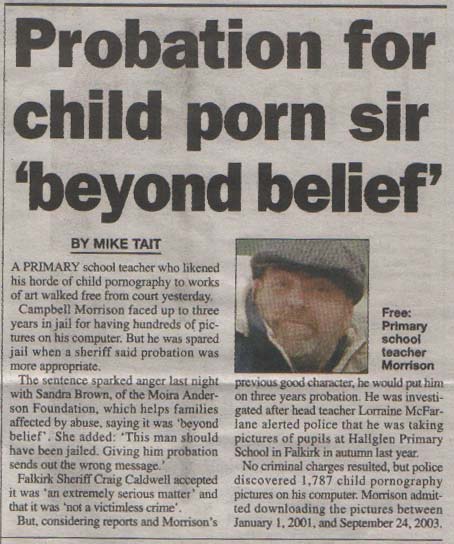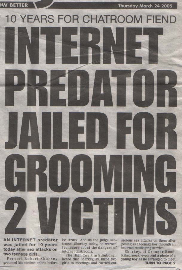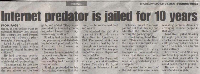 These following news articles were found during the research for "ROOM TO TALK" documentary. Click on the titles to read the articles. TITLE SOURCE DATE Computer Hacking Probe... Weekend Times Unknown Use New Law to kill paedophile... Metro 27/01/2005 Film Bosses Sue Internet... Metro 16/12/2004 Its Tons Too Fast Unknown Unknown A Cereal Killing Unknown Unknown Dad Finds Porn Flicks... Sunday Mail 31/10/2004 Sex Fiend Used Stethoscope... Evening Times 15/01/2005 Cop Accused of using Crime... Sunday Mail 31/10/2004 Teen Web Habits Revealed Metro 18/04/2005 Sex Line Chat Misses Mark News of the World 16/01/2005 Phone Pervs Warning Unknown Unknown Pop Star Backs Bid... Evening Times 23/12/2004 Move to Protect Teenage... Evening Times 23/12/2004 Probation For Child Porn Sir... Metro 17/12/2004 Sex Chat Perv Is Back... News of the World 17/04/2005 Internet Predator Jailed(F.P) Evening Times 24/03/2005 Internet Predator is Jailed(P2) Evening Times 24/03/2005 Sex Shame of Scaffold Sicko News of the World 15/01/2005 Baby Porn Bank Boss Unknown Unknown Club Mascot on Sex Offenders List Metro 27/04/2005 Mum Pushes for Ban on Net Sex Sites Metro Unknown Child Porn is 'Victimless'... Metro 08/12/2004